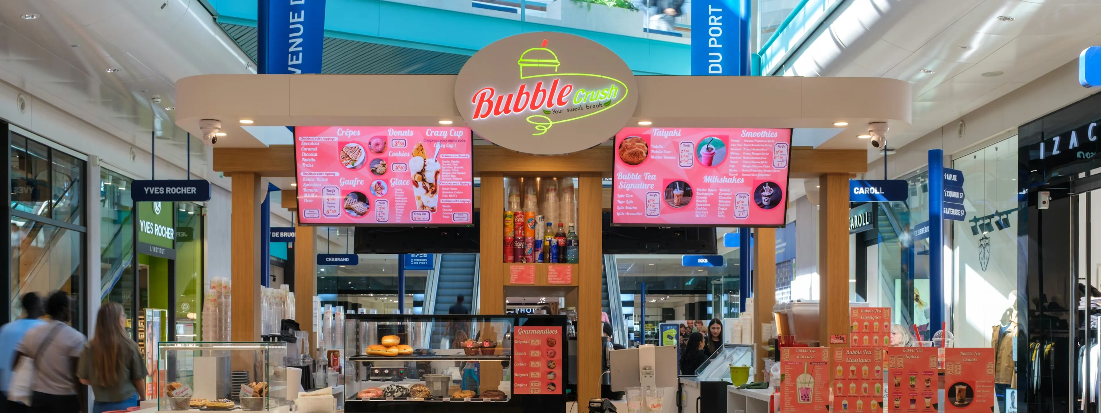 Bubble Crush est un café spécialisé dans le bubble tea, proposant des thés traditionnels agrémentés de perles de tapioca ainsi qu’un large choix de douceurs sucrées venues du monde entier. Ouvert en continu, l’établissement offre une expérience gustative unique permettant de « voyager » à travers des saveurs de différentes cultures. Avec des options vegan, végétariennes, halal et casher, Bubble Crush est idéal pour une pause dessert, une boisson rafraîchissante ou un moment cosy pendant le shopping.